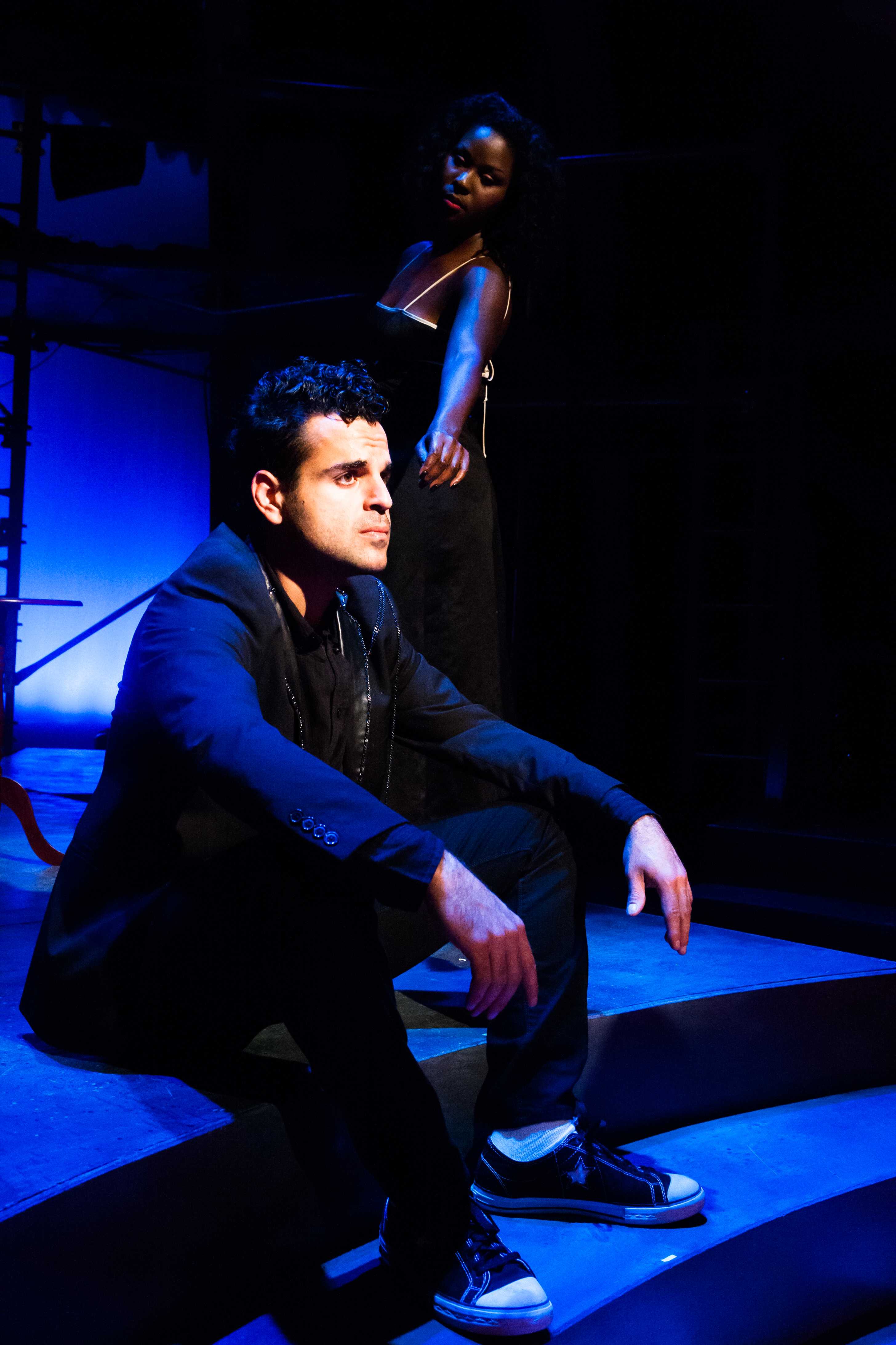 Whereas the recent production of American Idiot tried to blast audiences out of their seats in the Orpheum Theatre, I was fascinated to see how music director and bandleader Jonathan Fadner kept the music at a level which invited audiences into the drama without ever overpowering them. Many of the cast members double as instrumentalists:
