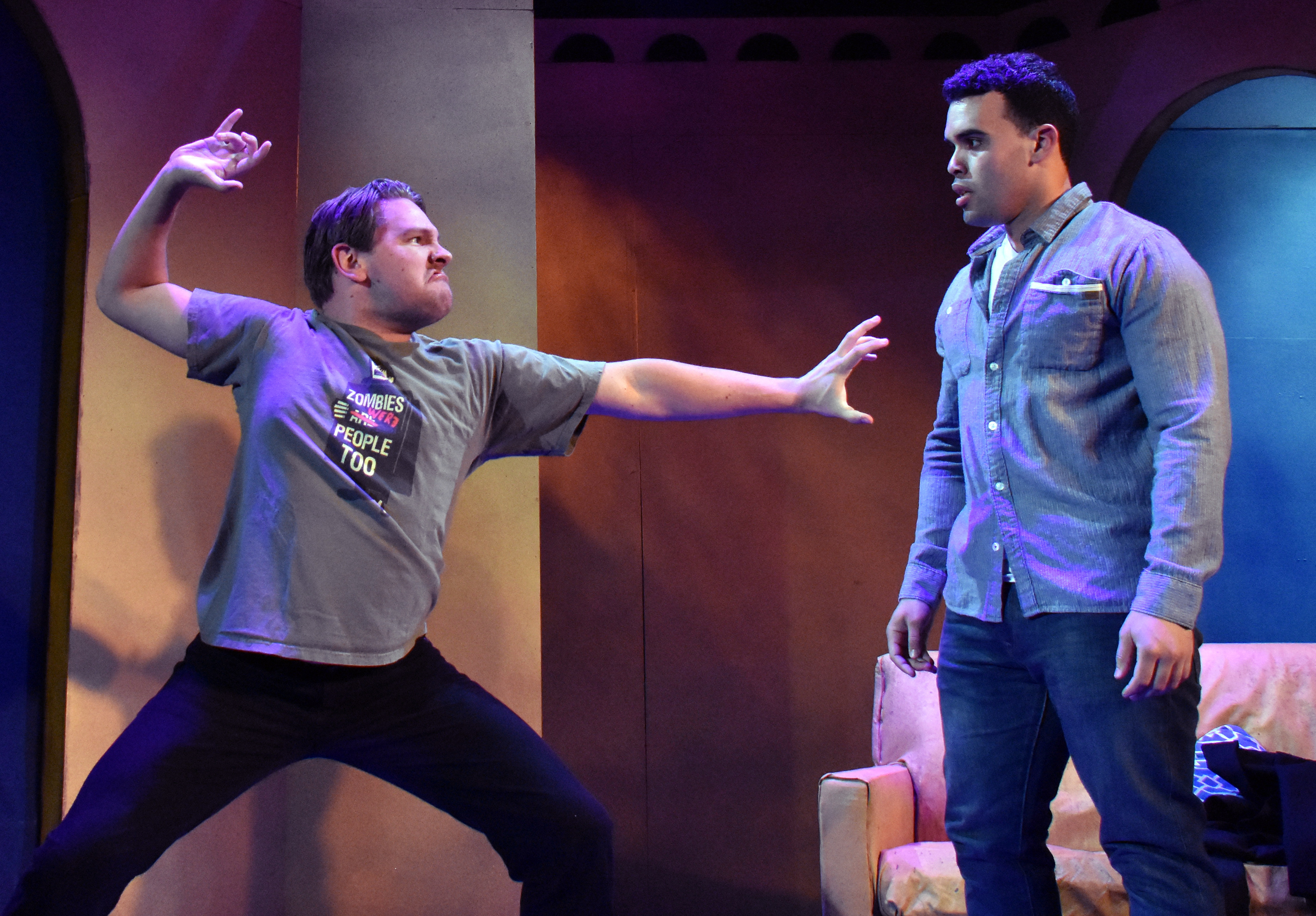 | Ryan (Drew Reitz) challenges Raul (Ed Berkeley) in a scene from In Love and Warcraft (Photo by: Jay Yamada) |